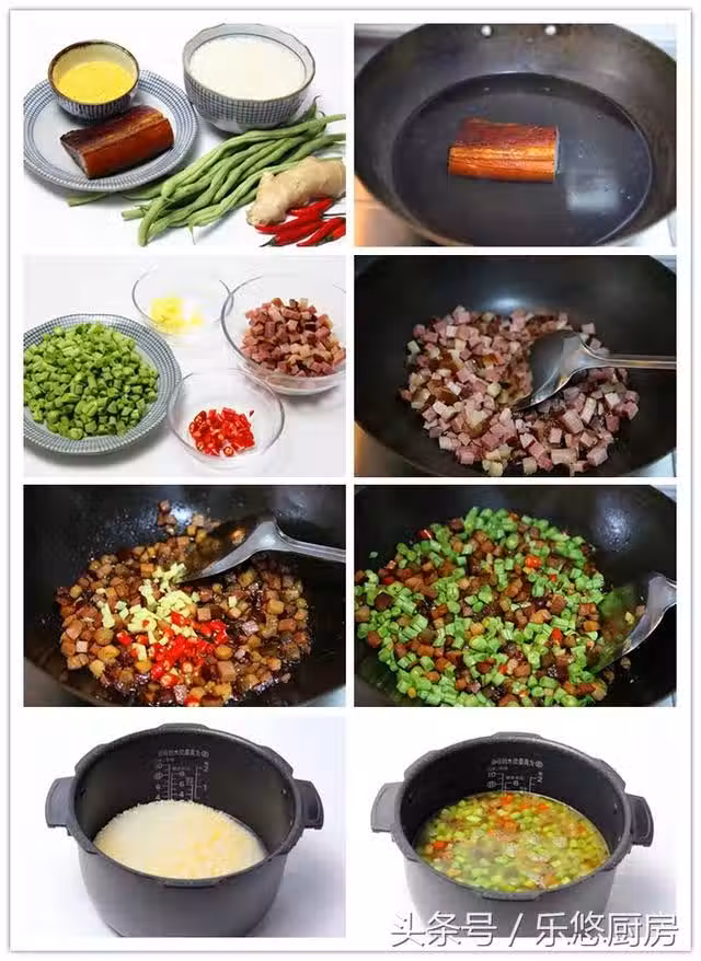 第八步:將炒鍋里的臘肉、豆角一起倒入電飯鍋中,再倒入適量的清水,然後選擇煮飯功能即可。(關於水量,平時煮飯倒入多少,現在放多少就可以了。通常用電飯鍋燜飯水與大米的比例為1:1,大家可以參考一下)