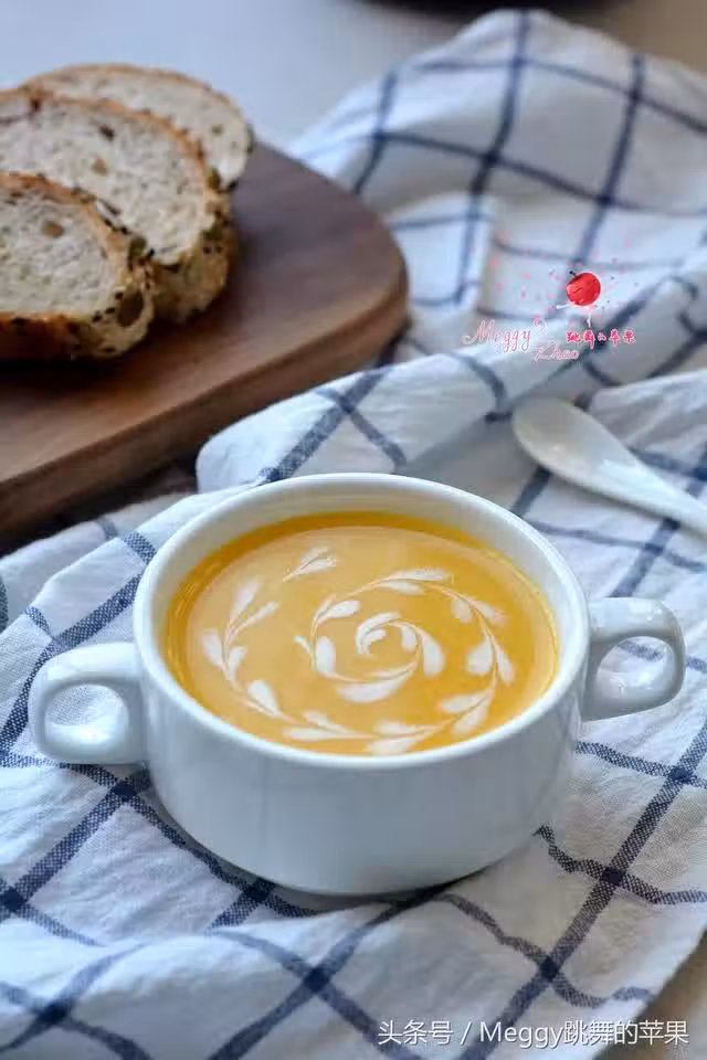 製作過程:南瓜去皮切小塊,與洗凈的食材同入豆漿機中,加涼水1100毫升,啟動「營養米糊」程序,米糊做好後可直接食用,也可稍涼一下,點幾滴淡奶油,做個漂亮的拉花。