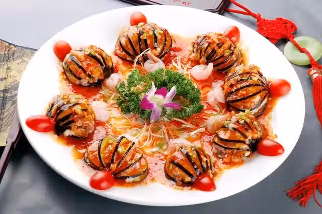 4、將番茄丁放入茄子瓣中,依次弄完燈籠茄子的做法