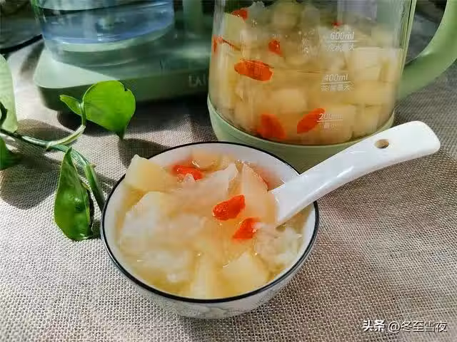 6.到時間後,倒出飲用即可,一道清甜可口的銀耳雪梨冰糖水就做好了。