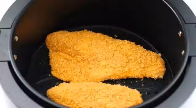 5、接下來,將魚排放入預熱好的空氣炸鍋中,以400°F(200°C)的溫度烘烤10-12分鐘,或者直到魚排的外部變得金黃酥脆,而內部熟透。您可能需要將魚排翻轉一次,以確保兩面均勻烤熟。