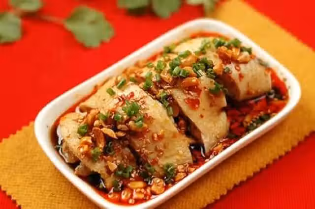 雞腿、熟花生碎、熟白芝麻、蔥、姜、料酒、生抽、醋、糖、鹽、紅油。