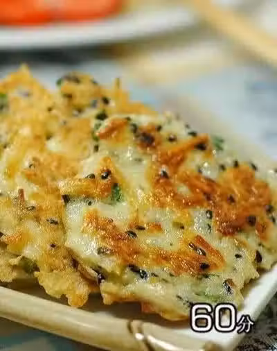 中等大小的土豆一隻,切細絲,然後稍微剁幾下,剁成小碎段,放入碗里,加一隻雞蛋,二匙麵粉,一小把蔥花,一匙芝麻,少許鹽和黑胡椒粉