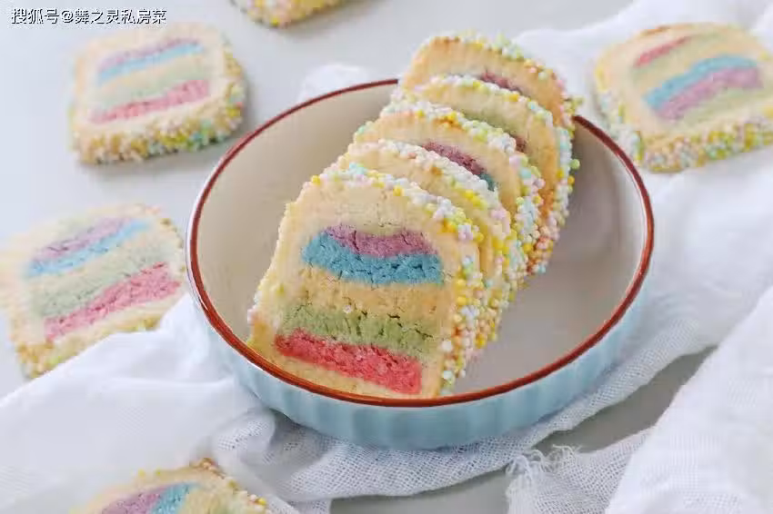 5、表面裹上之前分出來的三分一麵糰,繼續刷蛋清,沾上彩色糖珠,然後送入冰箱冷凍10分鐘左右、取出,切成餅乾厚的片,放入預熱好的烤箱,放涼後口感就很酥鬆了。