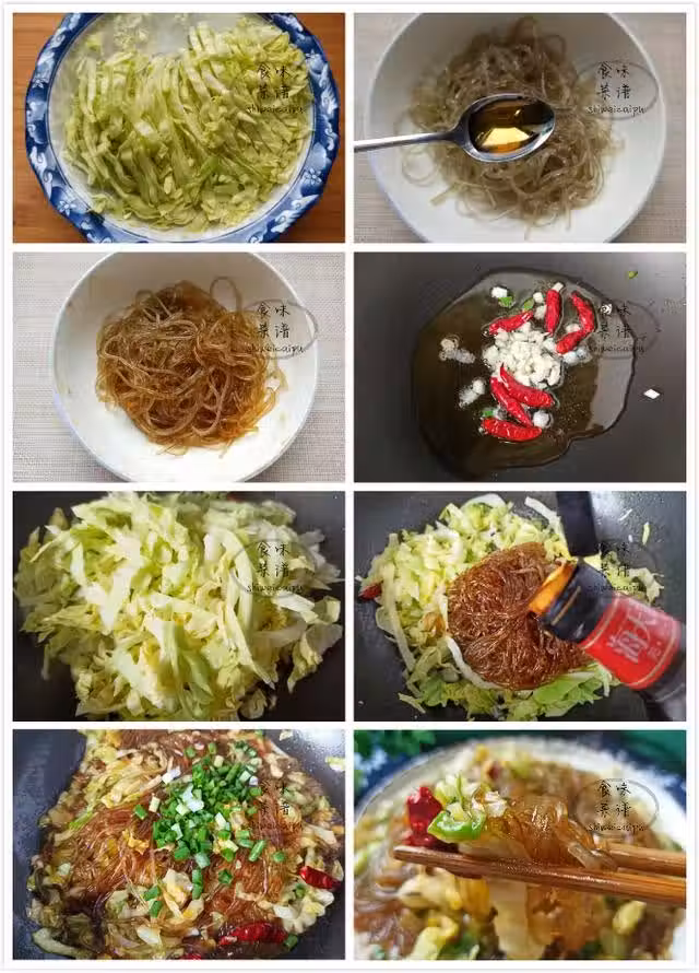 5、倒入粉條,加半勺食鹽、1勺生抽,再次大火翻炒20秒鐘。