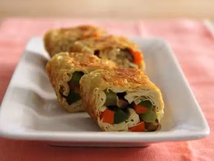 3.取三片作法1的半圓形腐皮對摺,在每層間都刷上調味料A,再把作法2內餡包,入腐皮中捲成條狀。擺在盤子上並覆上保鮮膜,再移入蒸籠。以大火蒸煮約5分鐘後,取出放涼備用。