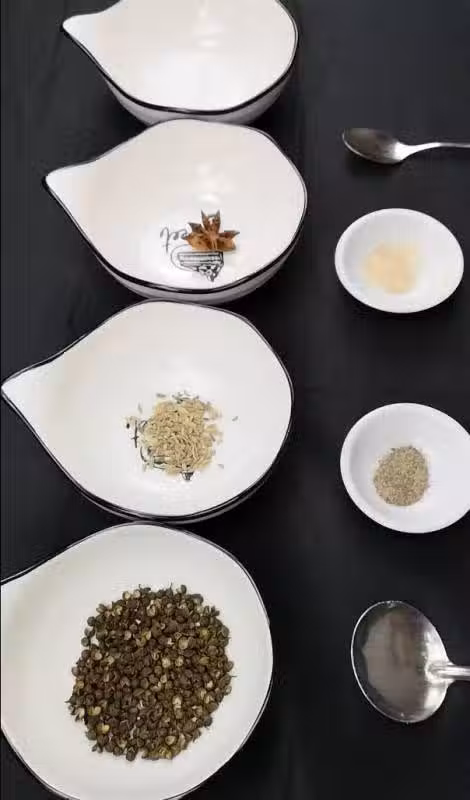 先將花椒、八角、小茴香放入鍋中,小火炒制5分鐘,炒出香味。