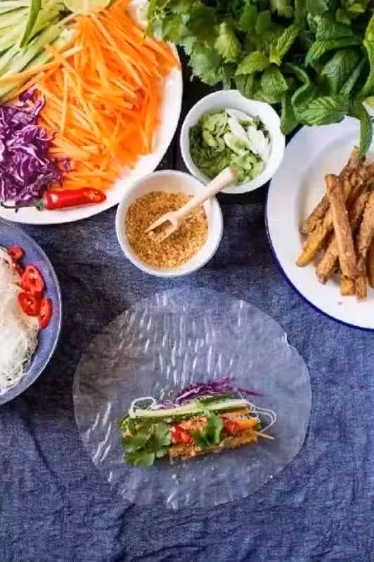 4、在米紙上依次放入豆腐、胡蘿蔔、彩椒、紫甘藍、花生碎,然後朝外翻捲即可。