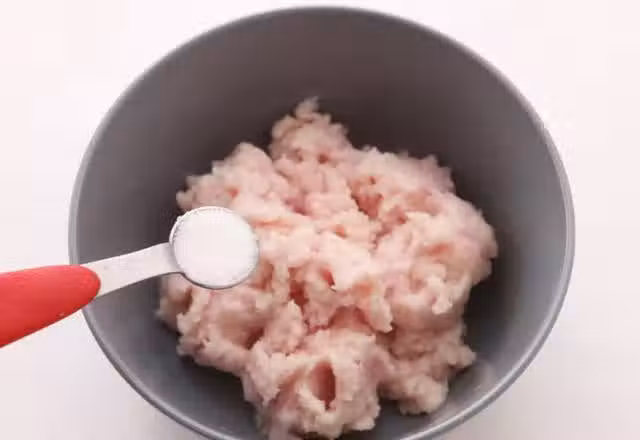 5、30分鐘後,把腌制好的魚肉糜,用勺子捏成圓形,裝盤備用。