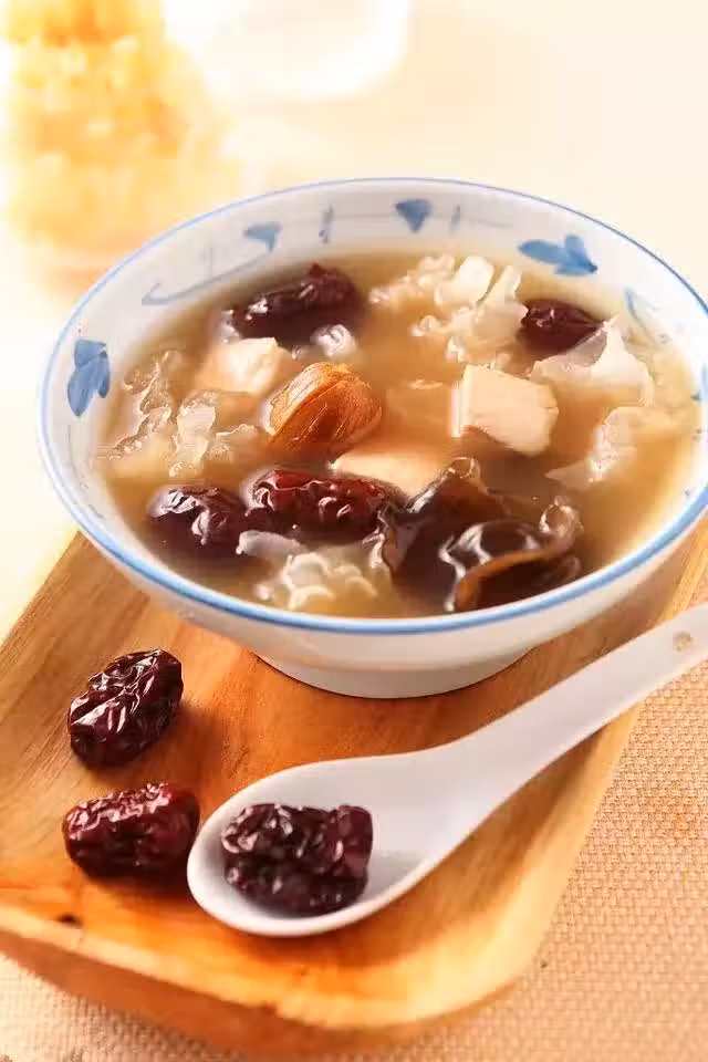 功效:黑木耳是所有蕈類食品中,含鐵量最高的,而且,它和白木耳一樣,都是多糖類,有一定的抗腫瘤作用,加上黑木耳又可清肺益氣、幫助身體排出纖維。此外,紅棗主治脾胃虛弱、血虛萎黃、血小板缺少症等等。因此,如果女性的臉色常常呈現黃色,多吃一些紅棗,就可以看到氣色紅潤,即使不用化妝品也能晶瑩剔透。