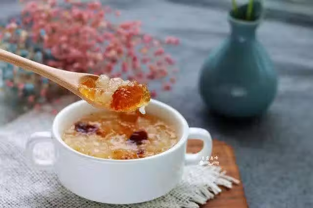 來吧,這是一碗滿滿的膠原蛋白,是女人最愛的經典甜品,裡面加了銀耳,桃膠和皂角米,另外還加了幾顆蔓越莓乾和冰糖,長期食用具有降脂養胃,養顏嫩膚的功效。