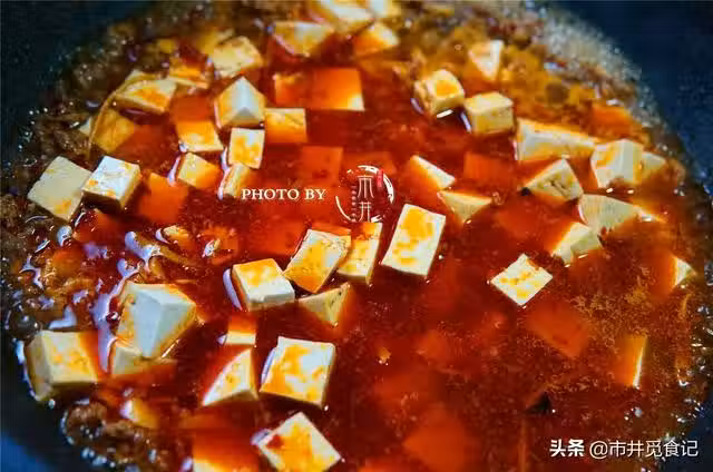 4、加入一碗水煮開,把豆腐推入鍋中,中大火燉10分鐘入味收汁。加入鹽、雞精、香油。