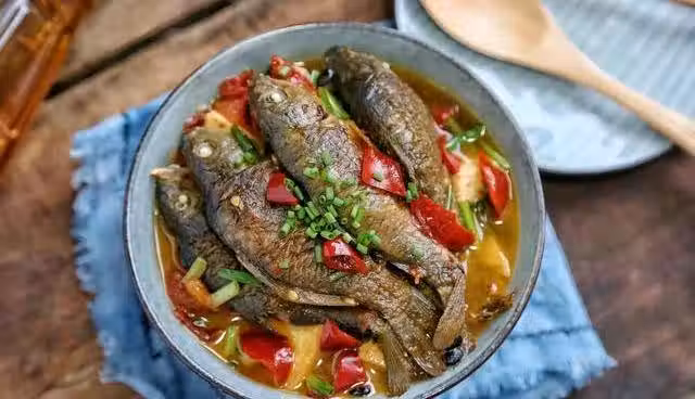 5,放入禾花魚和料酒燜煮6分鐘左右,調入鹽和蔥花拌勻即可出鍋。