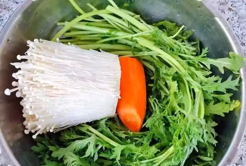 1. 準備原材料茼蒿摘好洗凈胡蘿蔔去皮金針菇去蒂洗凈。