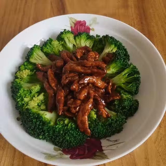 西蘭花半個;無公害豬精瘦肉300克;蚝油一大勺;醬油一小勺;鹽少許;生薑適量
