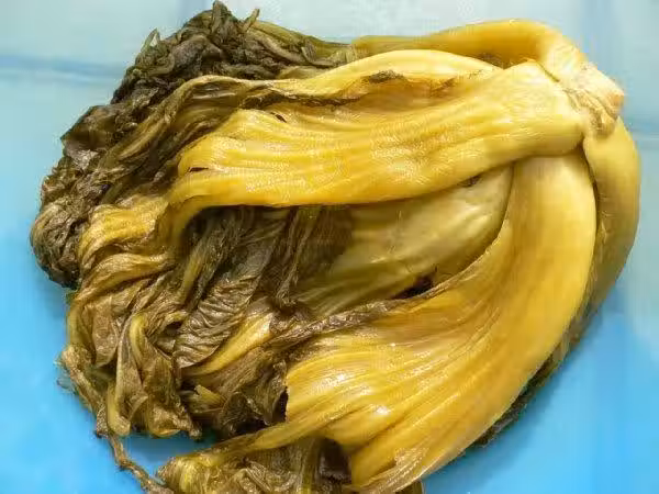 搓好的芥菜放缸里,然後把洗米水倒入缸里,洗米水要淹沒過芥菜,把它放置在陰涼通風處靜置兩天讓其發酵。