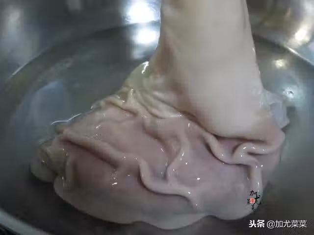 1、從菜市場買回來的新鮮豬肚翻洗一下,放入熱水中燙15秒左右撈起。熱水燙是為了後面清洗粘液更加方便快速。