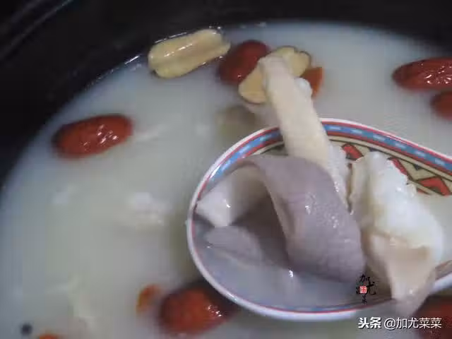 6、最後看到山藥全部溶於湯中,就倒入紅棗和枸杞,改小火煮15分鐘,出鍋前再加入小半勺食鹽提味即可完成。
