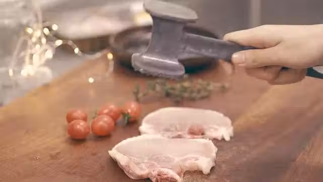 砸好的豬排兩面都抹上鹽和黑胡椒,輕輕拍打幾下。