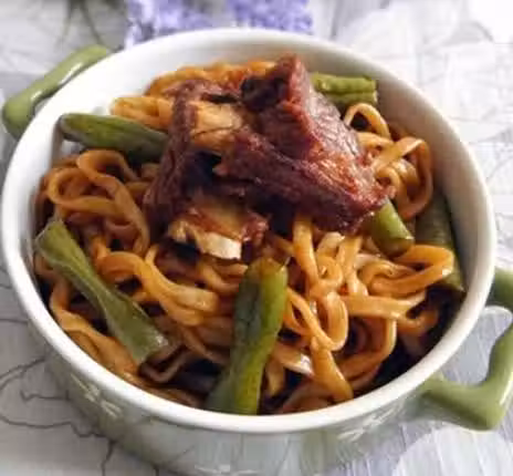 豆角500g;鮮麵條300g;排骨500g;蚝油;生抽;鹽;姜;蒜;花椒;八角