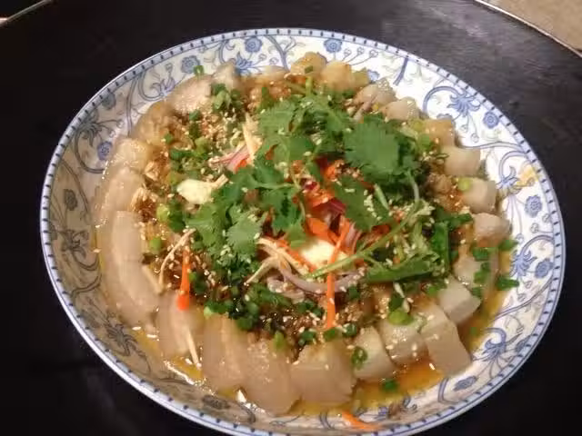 五花肉洗凈,置鍋中煮熟,鍋里放料酒、花椒;煮至軟熟的五花肉置冰水中冷卻