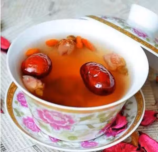食材: 桂圓4個、紅棗4個、枸杞2g、幹玫瑰花5朵、綠茶2g、蜂蜜適量