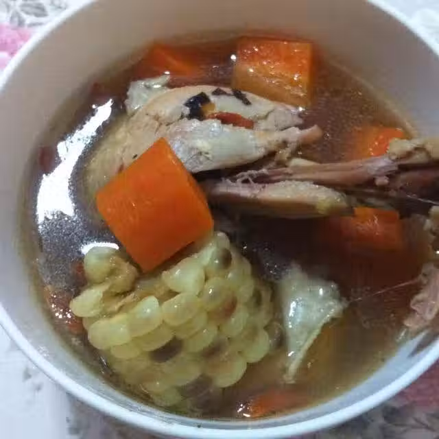 雞腿四個;胡蘿蔔兩個;玉米一根;枸杞一小把;味極鮮,鹽適量