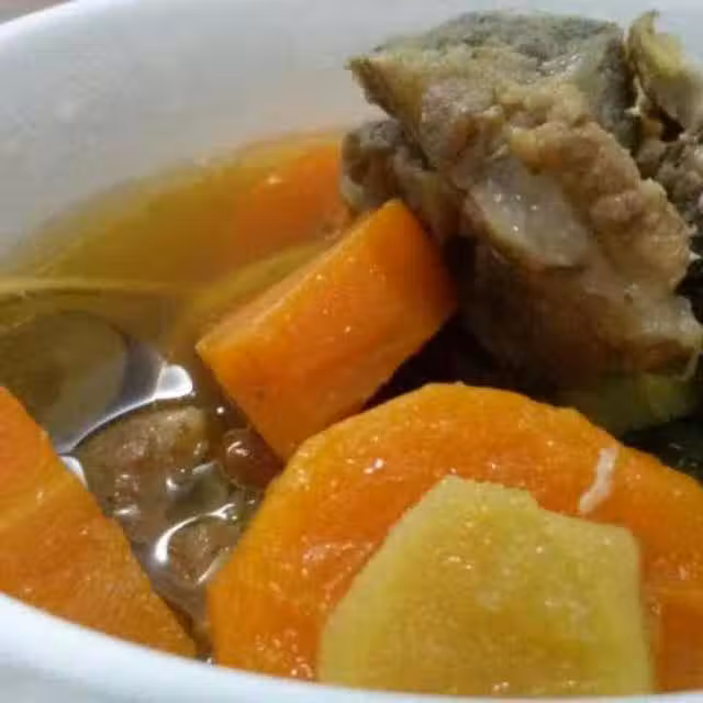 豬骨500g;胡蘿蔔3根;人參片5片;枸杞子15顆;大蒜3瓣;生薑片5片