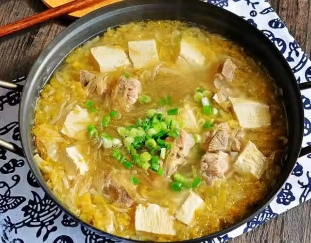 用料:東北酸菜300g;豬骨400g;凍豆腐200g;粉條80g;蔥姜適量;鹽適量;大料2個;香葉兩片;花椒15粒;料酒20毫升;蒜苗適量;雞蛋少許;