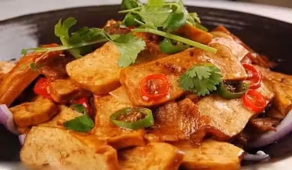 用料:豬肉250g、香乾6片、辣椒10根、豆瓣醬、姜、蒜