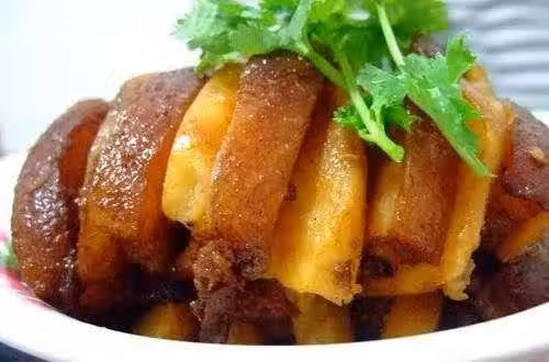 6.蒸好之後把五花肉的湯汁篦出來,蒸碗上面蓋盤子,再反扣在盤子上。篦出的湯汁燒開勾個薄芡澆在扣好的肉上即可
