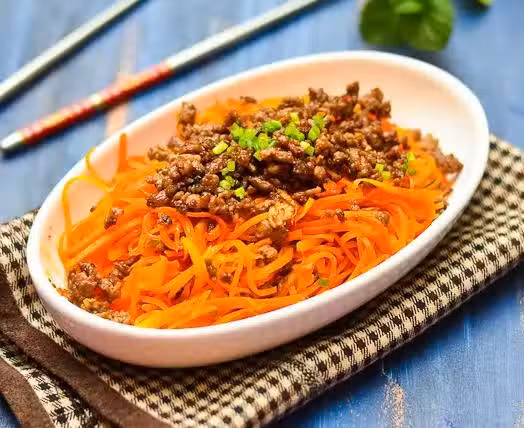7.胡蘿蔔絲用鹽國和生抽調味兒,之後將部分肉末回鍋,拌均