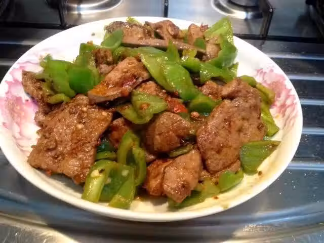 6.芹菜和紅辣椒炒幾分鐘後,放入豬肝翻炒。