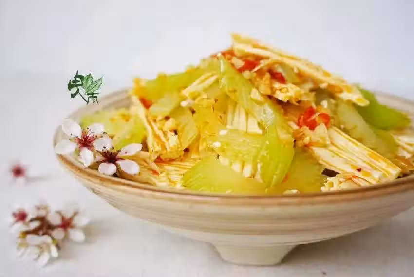 腐竹5條、西芹2根、剁椒適量、花椒適量、油少量、香油3-4滴、鹽半勺、生抽1勺