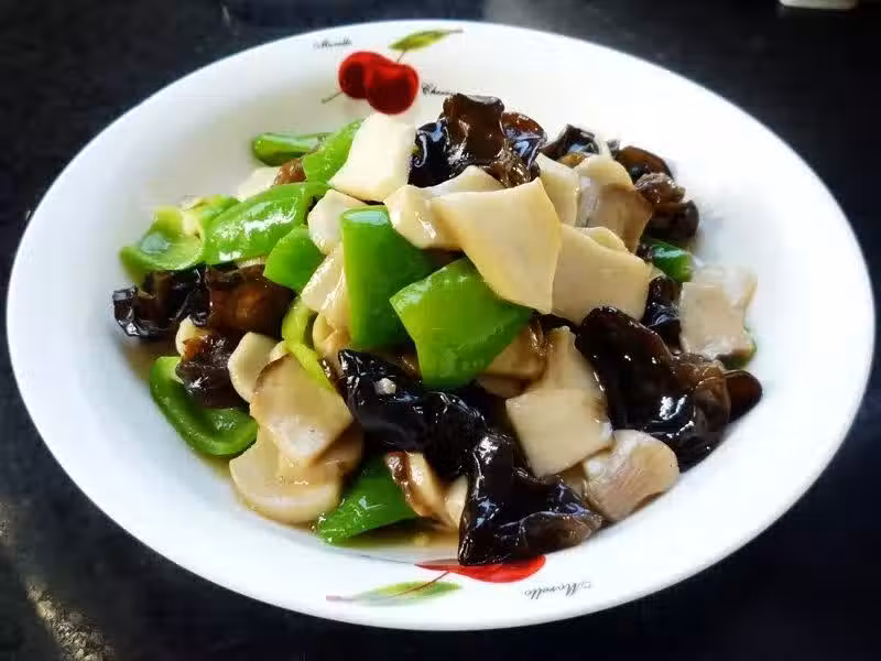 5. 鍋燒熱,放少許油,隨即倒入焯好的木耳和杏鮑菇翻炒