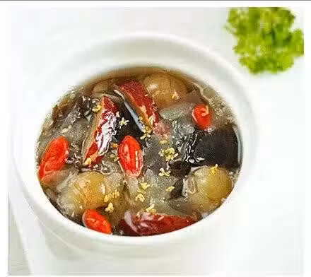 第三步,紅棗洗凈去核,棗肉切成小條,桂圓剝去外殼,一起放人鍋中,繼續 燉約20分鐘後放人桂花和冰糖 。
