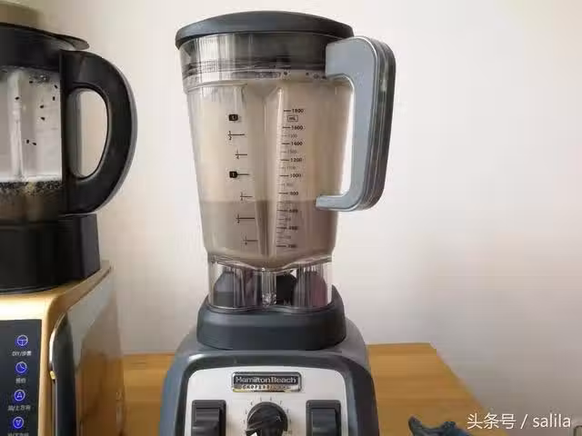 8、同時用另一台機器也做了一份好做個對比,這台機器是慢慢升溫的,攪打一會停一會。最後25秒才開始連續攪打。杯壁和刀頭下均殘留一下未被打碎的食物。