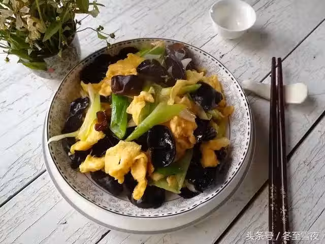 【木耳大蔥炒雞蛋】 材料:干木耳1把、雞蛋3個、大蔥2棵、油鹽適量、