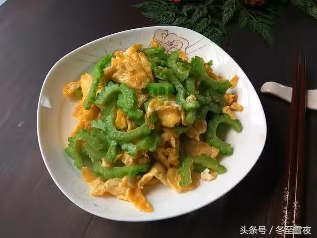【苦瓜炒蛋】 材料:苦瓜1個、雞蛋3個、鹽4克、植物油2湯匙