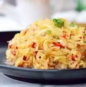 將捲心菜剝去外幫洗凈,直刀切成一寸長、半寸寬的碎段。入開水中煮兩三分鐘撈起,不可過度,瀝去水放在碗中。將醬油、香油、白糖、食鹽調入攪拌勻即好。除此,還可加入蝦米、香乾、青紅辣椒絲,調以醋,做成糖醋味捲心菜。