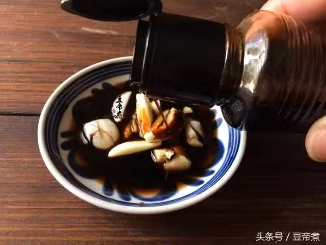 2、把蒜頭去皮拍扁,加入少許生抽腌制一會作為蘸醬