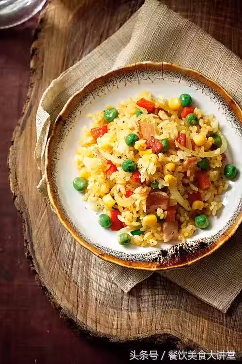 2、炒鍋熱油,下入培根微微煸炒,再依次下入洋蔥、紅菜椒、豌豆、玉米粒翻炒均勻