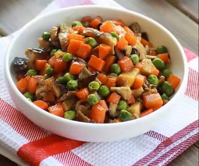 食材主料 香菇3朵 胡蘿蔔1根 碗豆150g 輔料 油適量 鹽適量 蚝油2大勺 生抽適量 糖適量 水澱粉適量 蔥姜適量