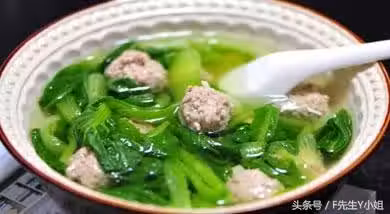 4、加兩片姜,水沸後打去沫子,煮至丸子飄起。加入小白菜,鹽,幾滴香油,胡椒粉調味,再煮10-15分鐘即成。