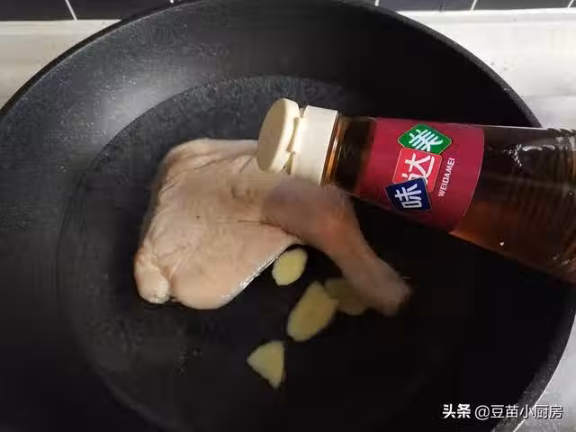 3、雞湯想要鮮美好喝沒有腥味,一定要焯水,這樣能有效地去除腥味,還可以去掉雞肉表面的脂肪,減少湯里的油脂,喝起來也不膩口。鍋里接一些涼水,把雞肉放進去,放入薑片,倒入一勺料酒,開火煮一小會,煮好後,我們把雞腿撈出,清洗乾淨血沫。