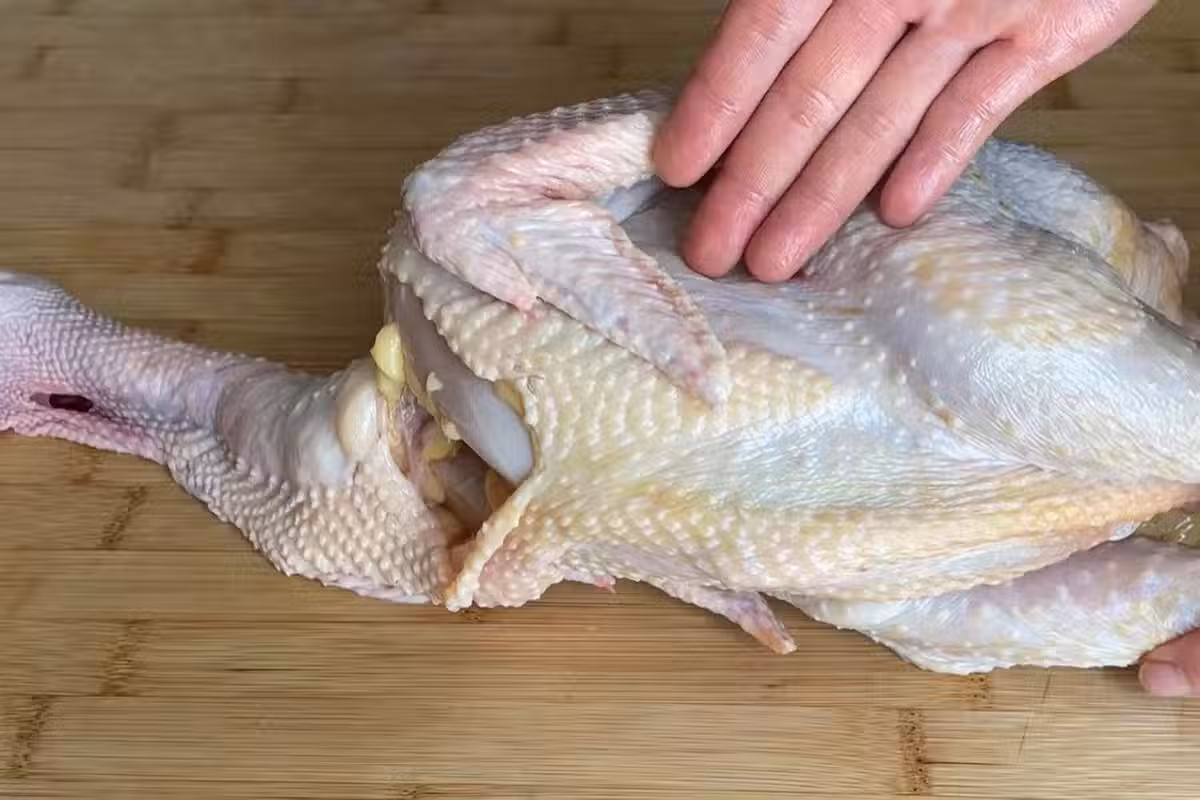 1、首先我們準備一隻洗乾淨的雞,這只雞是我在朋友的農場裡抓的,口感比起市場裡用飼料養的雞會更好,大家也可以直接在市場上買宰殺好的雞。