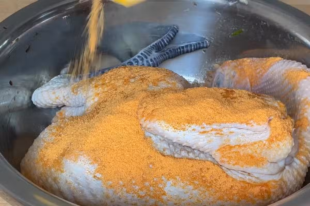8、隨後在雞身上倒入一袋鹽焗粉,用手搓勻,醃制20分鐘。因為前面加了醬油,而且鹽焗粉本身就含有食用鹽,因此做這道家庭版鹽焗雞的整個過程都不需要加鹽。