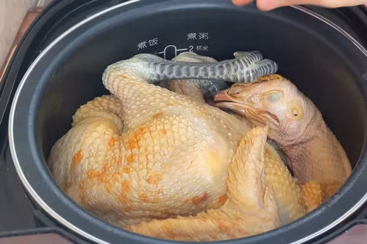 10、將醃制好的一整隻雞塞進電飯煲裡,把醃制雞肉剩下的料汁也倒進去不要浪費,按下煮飯鍵之後,等到電飯煲自身設定的時間結束之後就可以了。