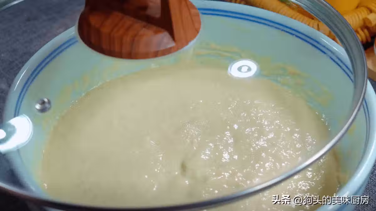 4.發酵好的麵糊體積變大,拉開內部可以看到豐富的氣孔。