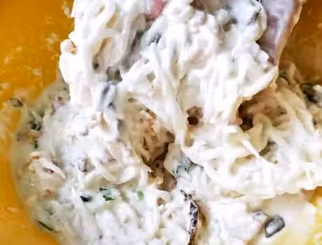 第四步,待蘿卜絲中的水分逼出後,倒掉水,然後在蘿卜絲中加入粘米粉,同時將其他炒好的食材一同放入其中,用手將其抓拌均勻,準備一個蒸盤,刷上點食用油,將拌好的蘿卜餡放入;